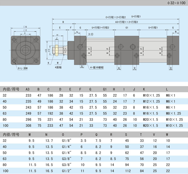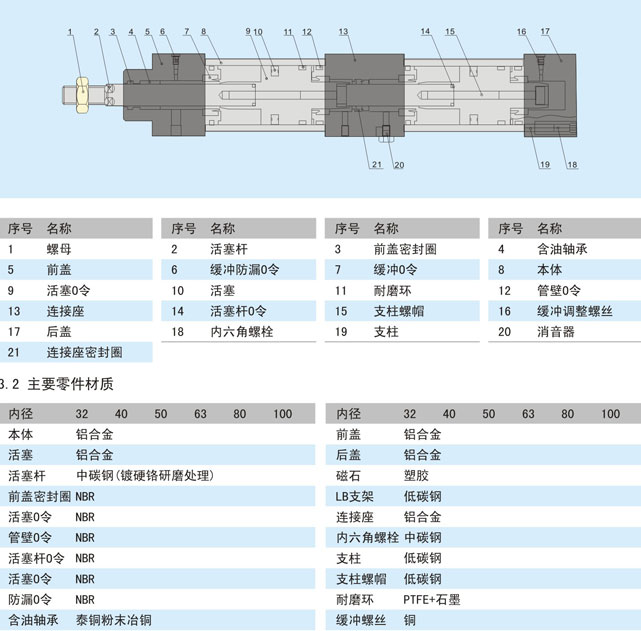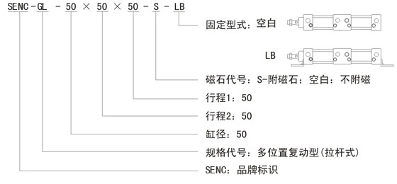 5.4 訂貨示例:欲訂購缸徑63、行程1為50、行程2為80、附磁石、底座安裝的SENC-GL系列三位式氣缸20臺。